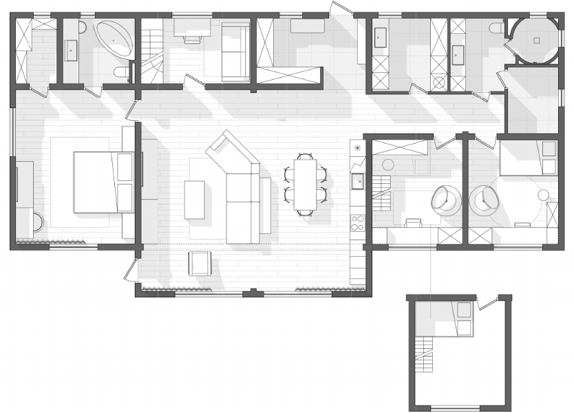Этот дом полностью отражает его владельцев - серьезных, статных людей, выбирающих для себя самое лучшее, и не готовых идти на компромиссы. В проектировании мы использовали натуральные материалы: дерево, камень, стекло. Многие предметы мебели выполнены под заказ по нашим индивидуальными эскизам.