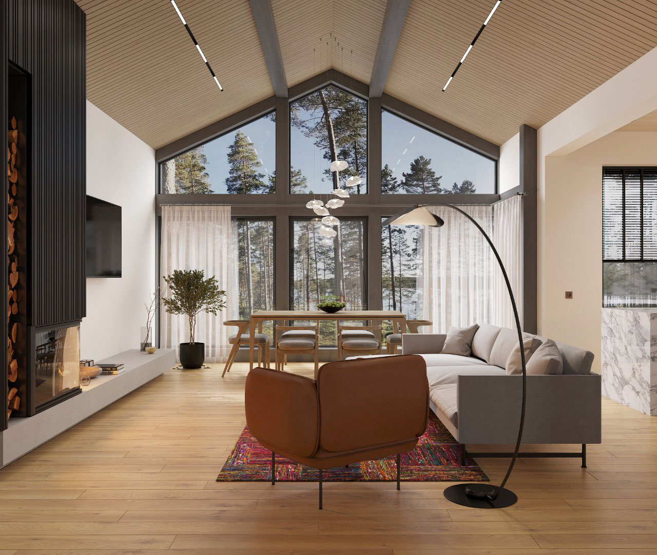 В этом проекте мы использовали в основном натуральные материалы и текстуры: шерсть, кожу, камень, дерево, лен. В результате у нас получился уютный стильный дом, где воплотились все мечты заказчиков. А сидя за обеденным столом, можно наблюдать закаты над Ладожским озером.